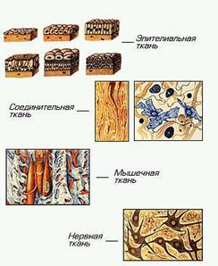 строению и функциям. В состав тканей входят также тканевая жидкость и продукты жизнедеятельности клеток. Ткани животных — эпителиальная, все виды соединительной, мышечная и нервная; ткани растений — образовательная, основная, защитная и проводящая.