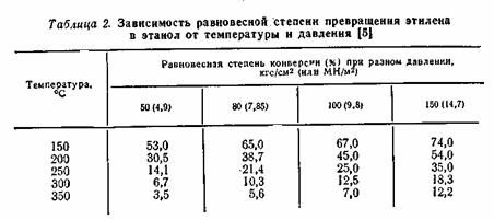 В таблице 2 приведена зависимость равновесной степени превращения этилена в этанол от температуры при разных давлениях.