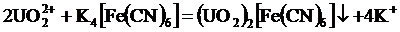 Для качественного определения урана и тория применяют методы химического, радиометрического, спектрального, а для урана еще и люминесцентного анализа. Химические методы основаны на различных реакциях взаимодействия урана и тория с неорганическими и органическими реагентами с образованием либо трудно-растворимых, либо окрашенных соединений. В аналитической практике для качественного обнаружения урана и тория предпочтение отдается методам с образованием окрашенных соединений. Так, например, ион уранила с неорганическим реагентом – ферроцианидом калия – образует осадок красно-бурого цвета: